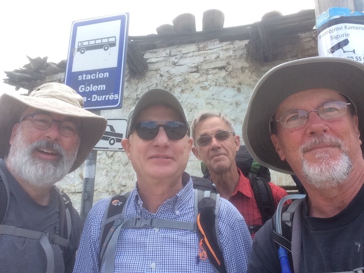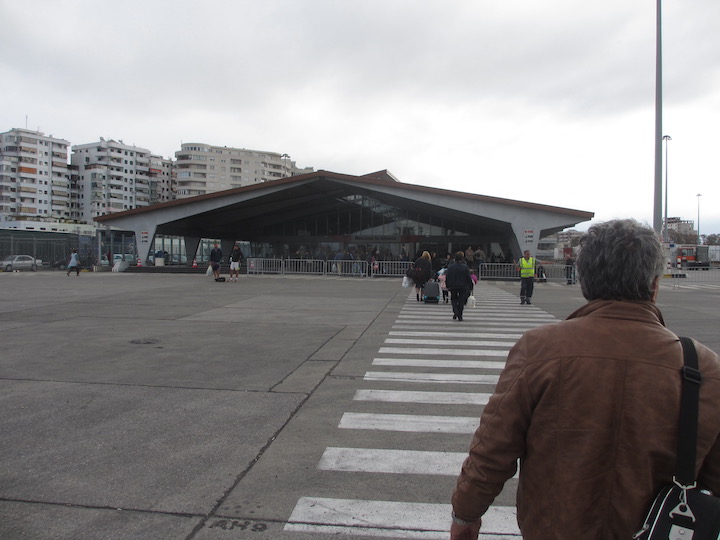 After exiting the ferry, there's a quick walk through customs, and then over a pedestrian bridge into a central plaza. There you will find many people begging, can purchase some lek, and find a bus going to Golem fairly cheaply. It looks as if the path through Durres is walkable but we wouldn't recommend it. Its all urban, and somewhat rugged. People on the bus will be happy to help you get off at the stop in Golem where the tracks begin.