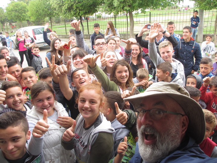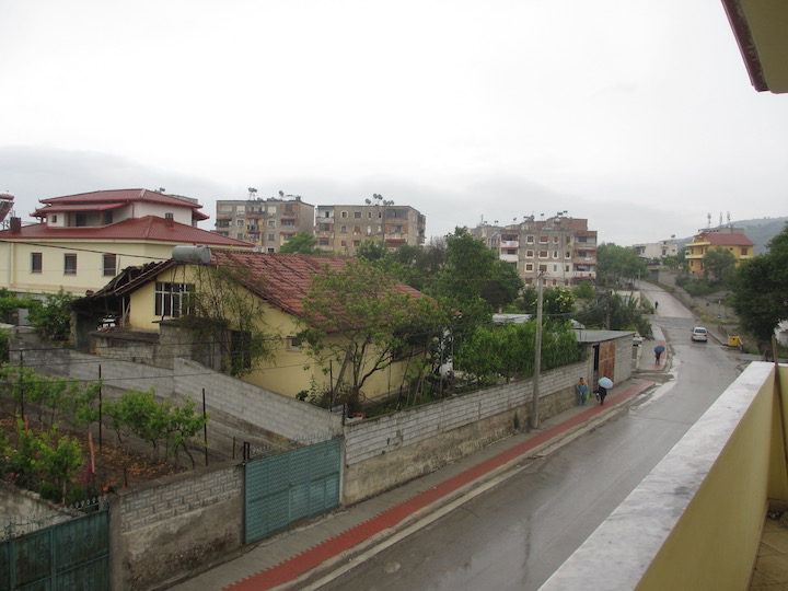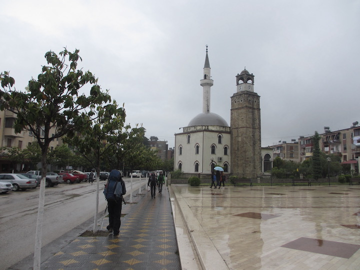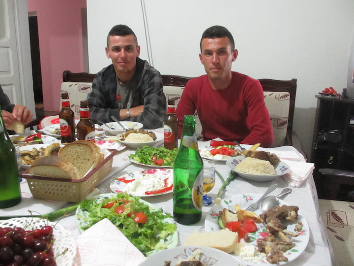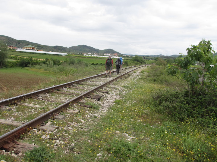We stopped for groceries near the ruins of the old church, then walked back up the street to the train station. From the station we walked east, following the original route of the Via Egnatia. This was a nice walk along the tracks into Lolaj, where we ran into a huge number of school children at a coffee shop. We spent a lot of time talking to the school children and drinking coffee. Near #4 on the map we stopped at a cafe, where we had a wonderful mixed grilled food lunch. Then across a rough old bridge, and after passing through a town we walked through beautiful farm land along the river. After several kilometers it started raining and it was a difficult muddy walk into Broshke. In we asked at several houses to try to find a place to stay. We finallly found the house of Tomarr Baho, where we were welcomed with homemade grappa and coffee. We ate a huge meal with this wonderful family and we stayed the night in Ingrit Baho's house across the street.