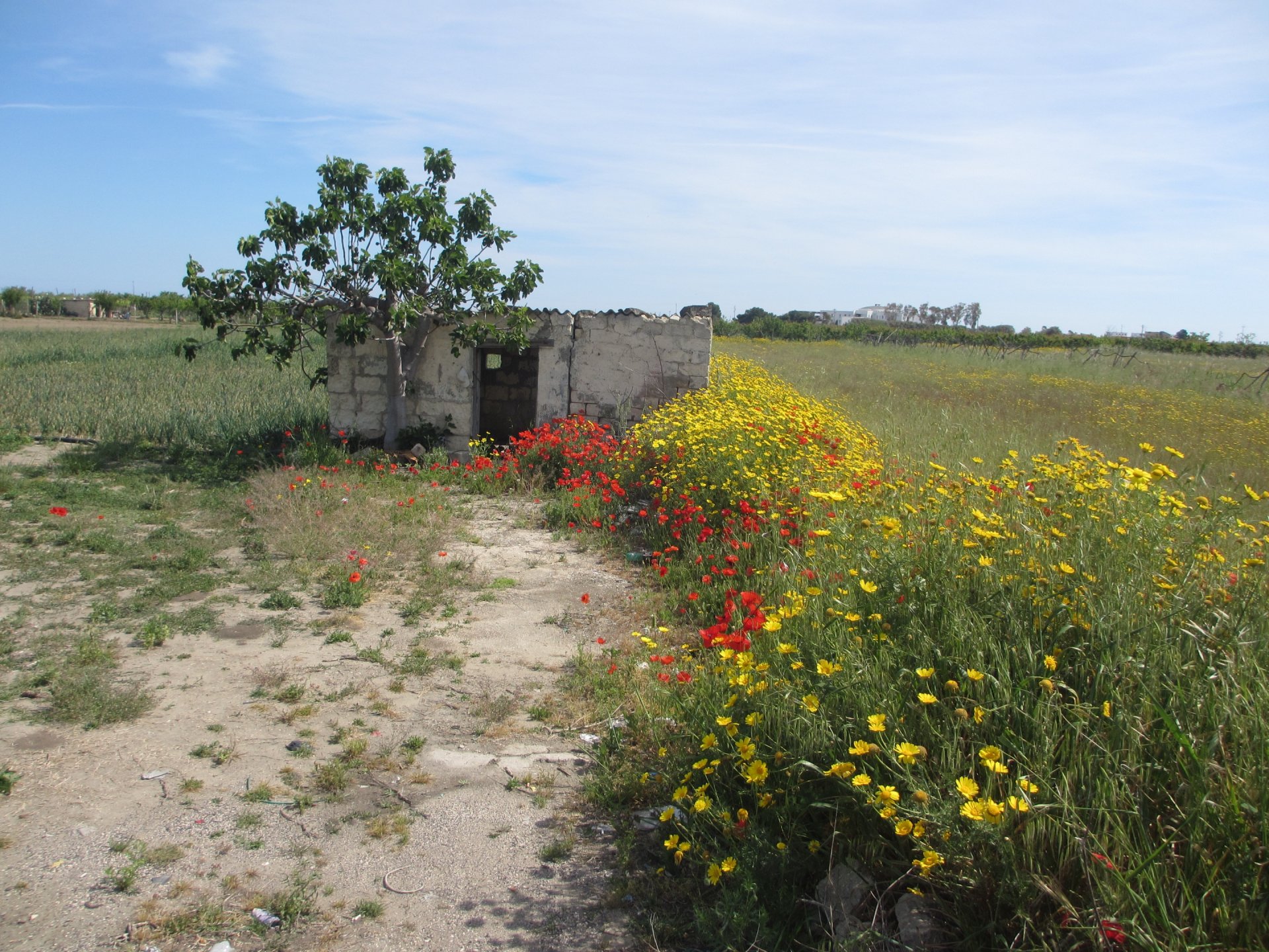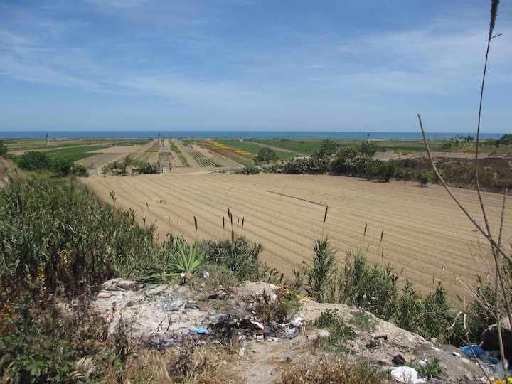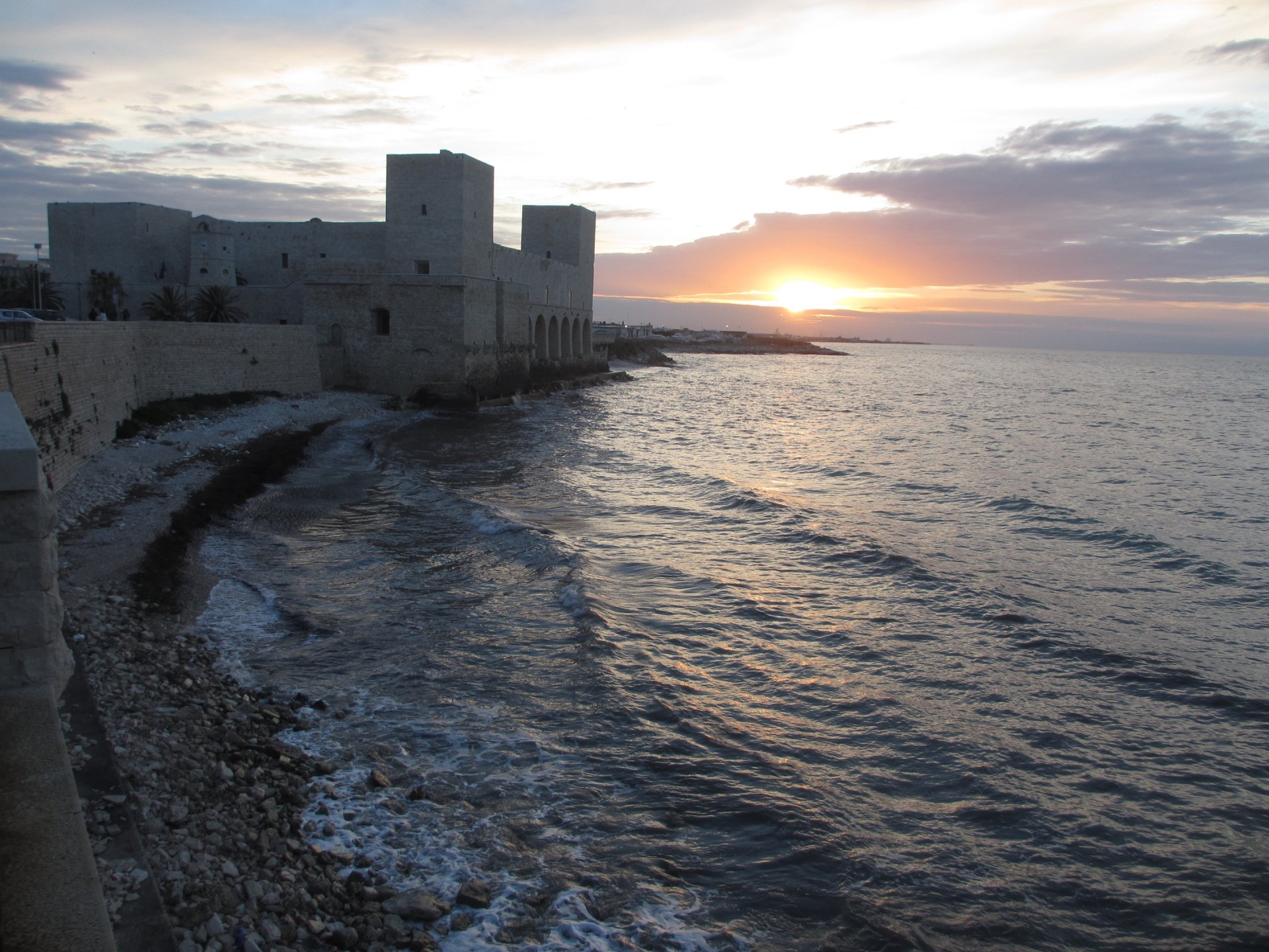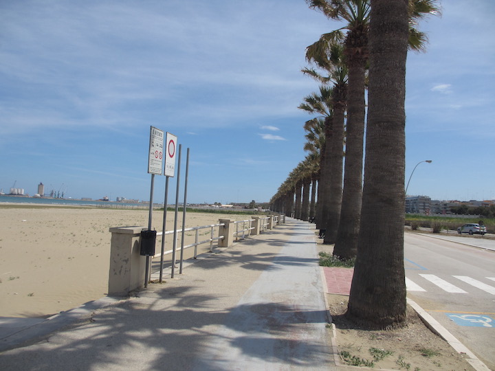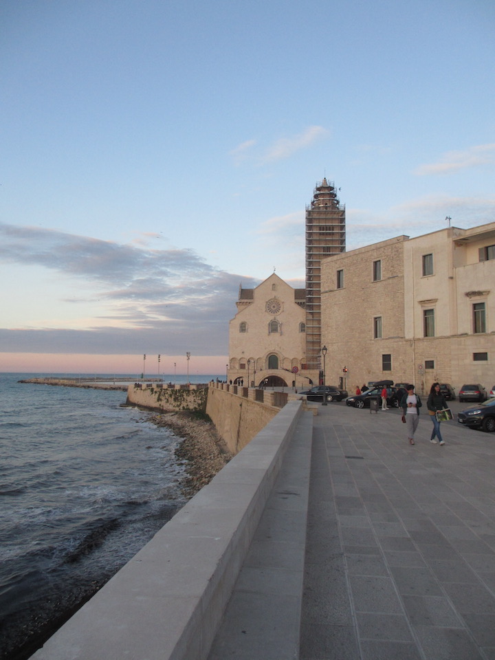 Leaving Margherita, we took the SS152 and after crossing the river we left the main highway. Then we followed the road that makes a diagonal into Barletta. We ate lunch under the palm trees along the lunghomare. Leaving Barletta, we stayed along the path along the coast, which makes for a very nice walking path. It is a narrow, relatively isolated country lane, which becomes increasing isolated after crossing a small bridge over a canal (very close to the sea). We followed this and then back roads, until the road widens out and becomes what seems to be a gay cruising area, near the entrance of a road from the highway. The back roads enter an industrial part of Trani, with a lot of marble factories. We stayed at the Trani Area Sosta--the first tent campers ever to stay there.
