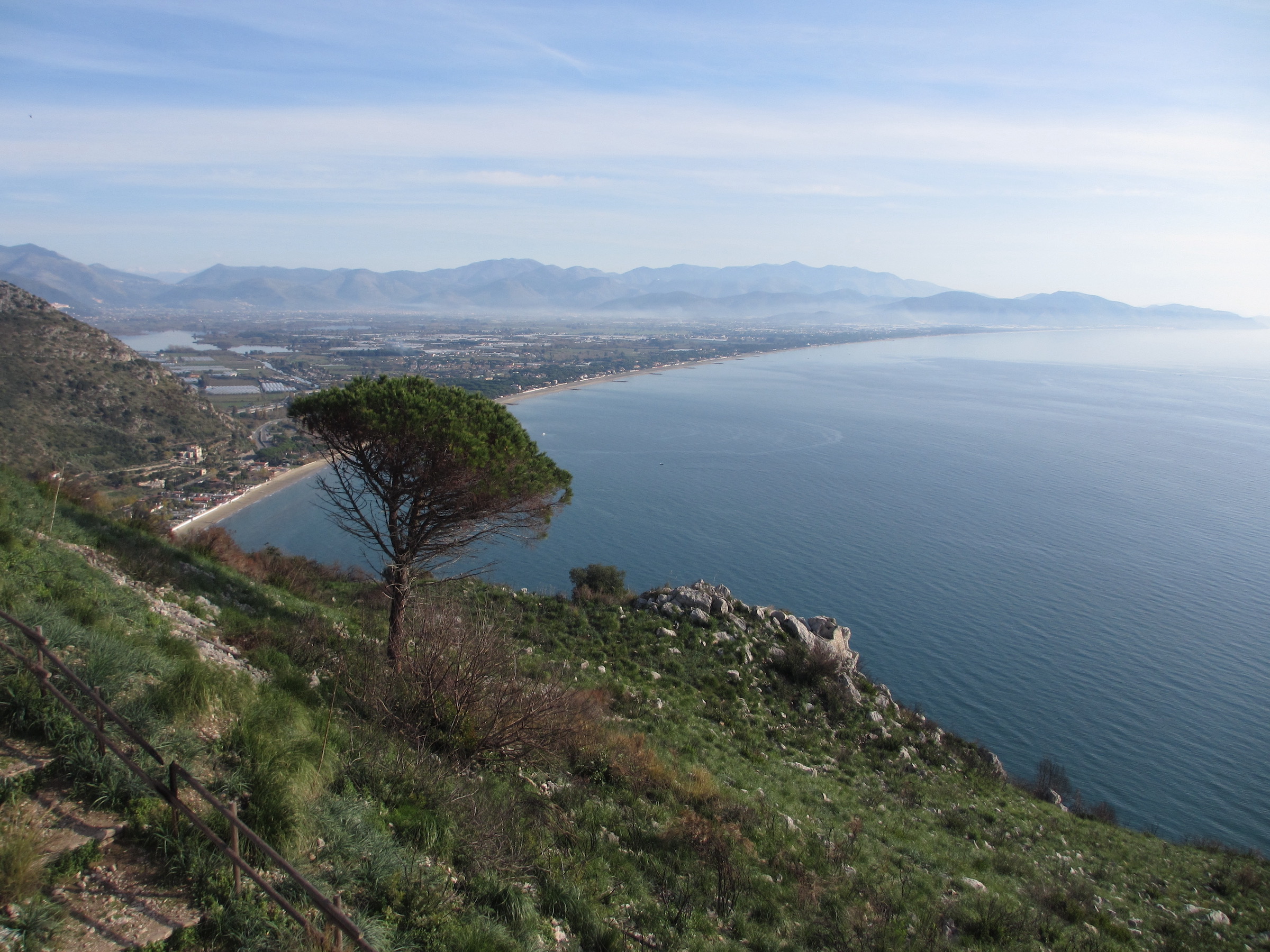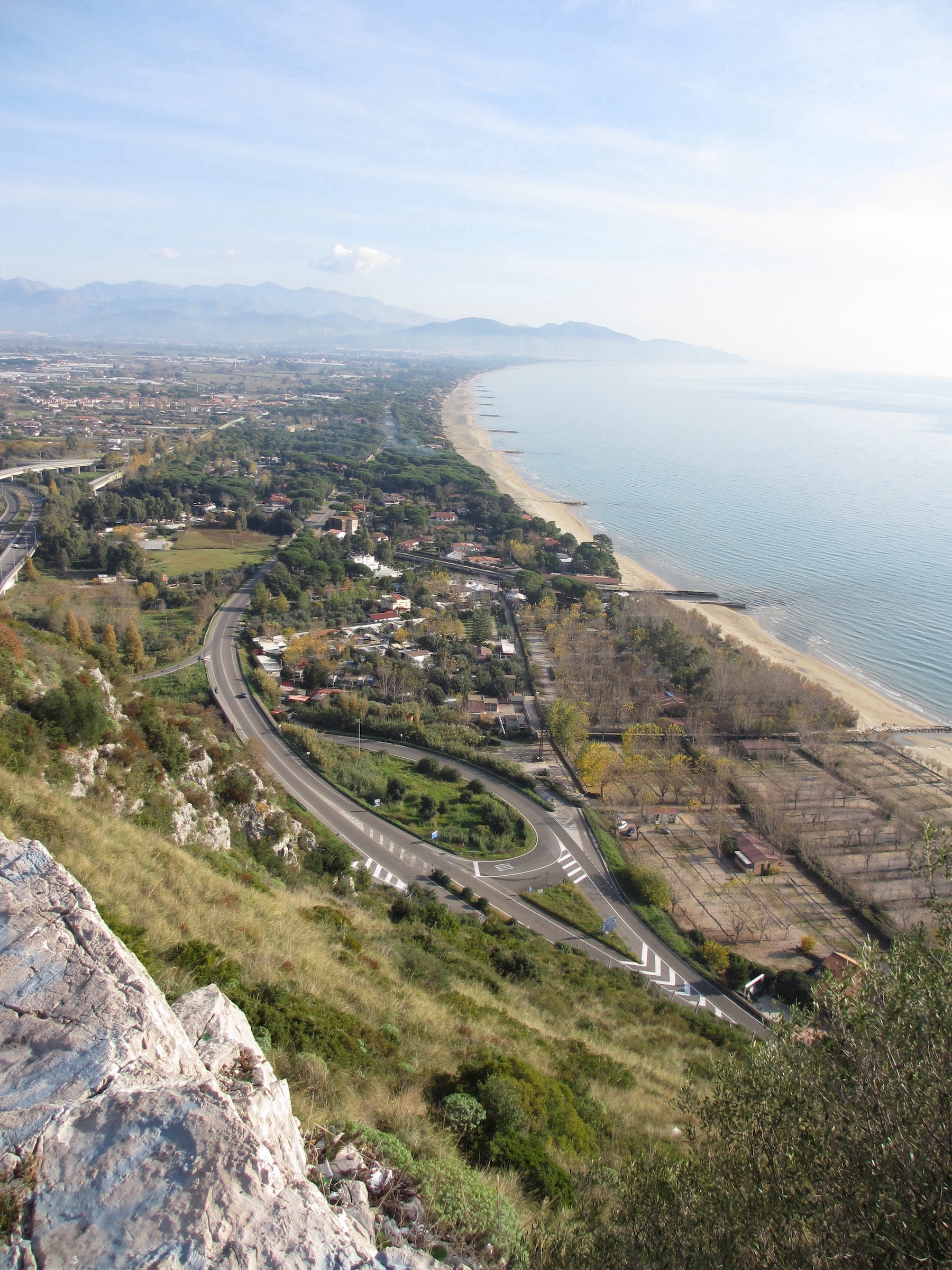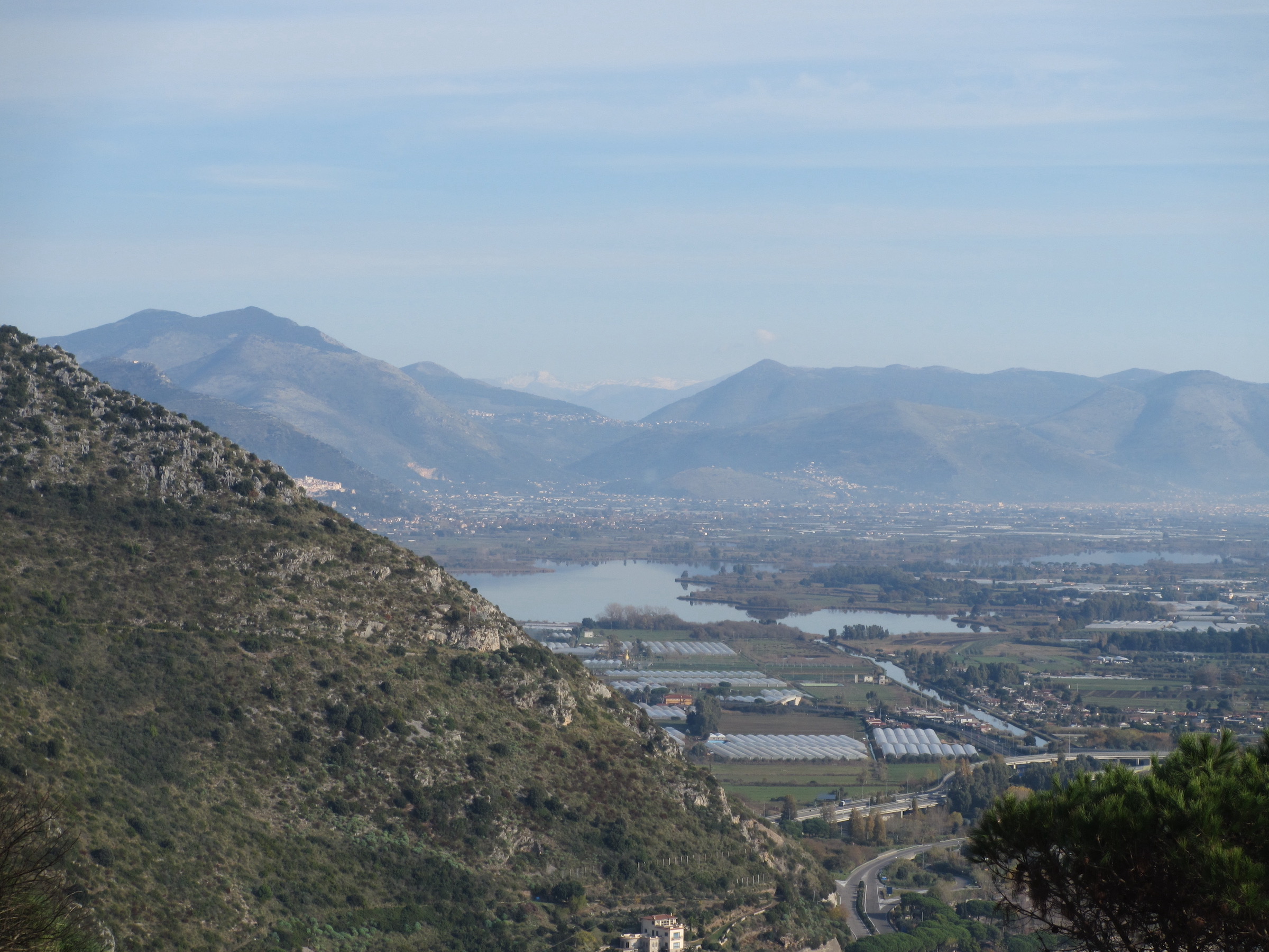 After leaving the sea, the route runs along a hill, a nice path, with continuing great views. Within several kilometers past Terracina, the Lake of Fondi can be seen from the Via Appia, where between it and the mountain (Lautulae Pass) the Romans, in their conquest to the south, were famously defeated by the Samnites in 315 B.C.