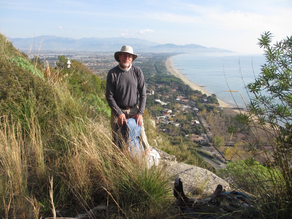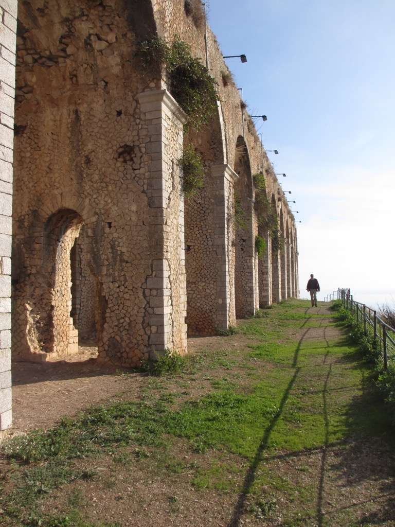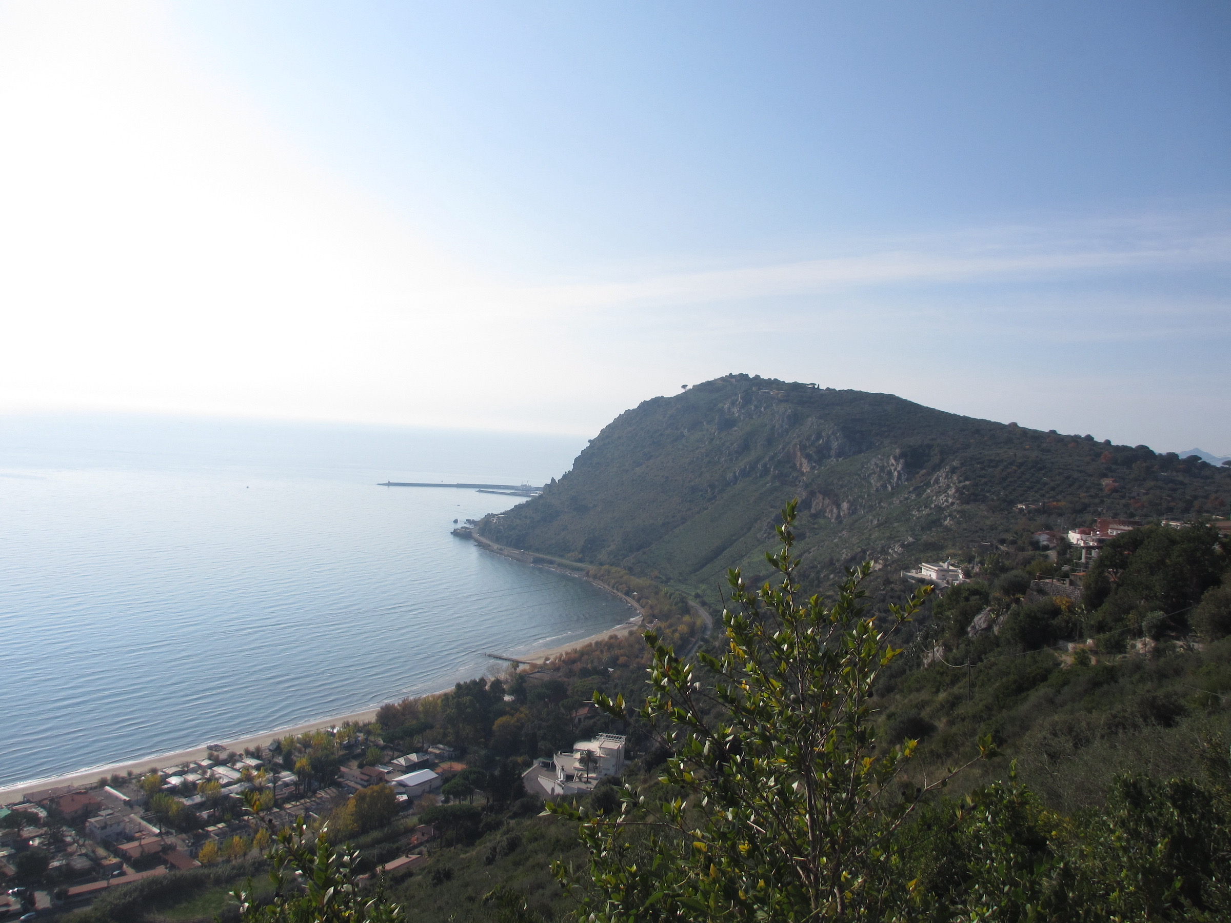 After leaving the sea, the route runs along a hill, a nice path, with continuing great views. Within several kilometers past Terracina, the Lake of Fondi can be seen from the Via Appia, where between it and the mountain (Lautulae Pass) the Romans, in their conquest to the south, were famously defeated by the Samnites in 315 B.C.