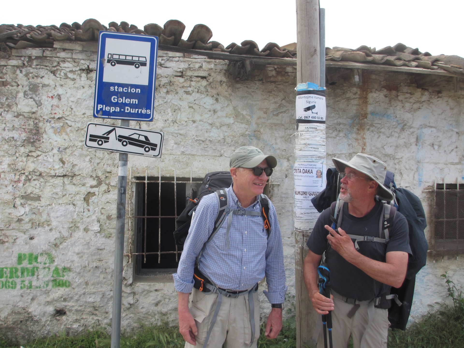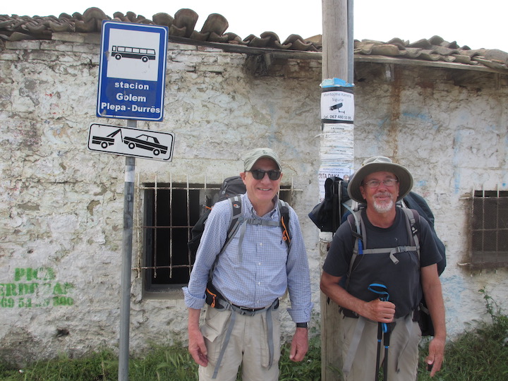 After exiting the ferry, there's a quick walk through customs, and then over a pedestrian bridge into a central plaza. There you will find many people begging, can purchase some lek, and find a bus going to Golem fairly cheaply. It looks as if the path through Durres is walkable but we wouldn't recommend it. Its all urban, and somewhat rugged. People on the bus will be happy to help you get off at the stop in Golem where the tracks begin.