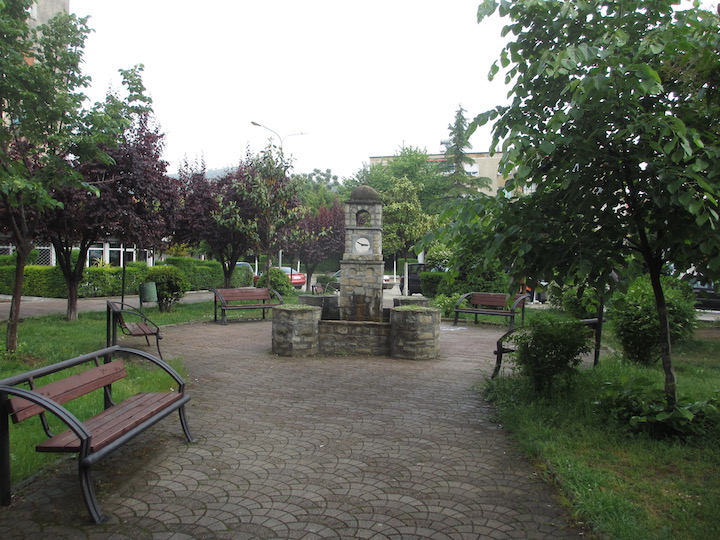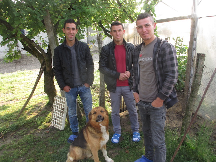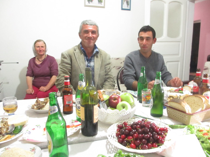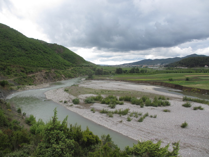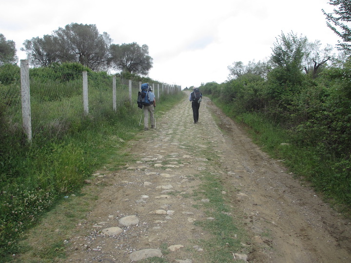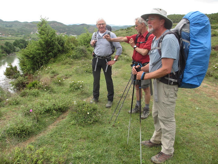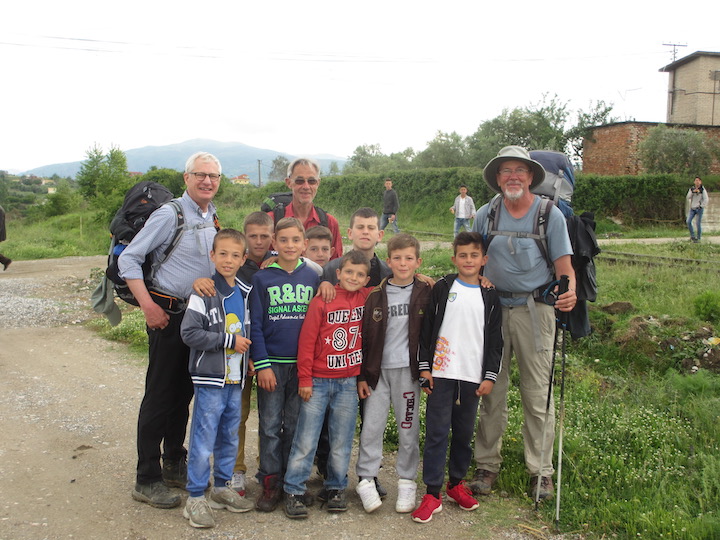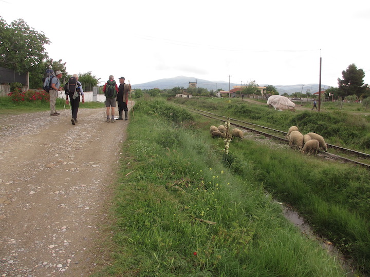 We stopped for groceries near the ruins of the old church, then walked back up the street to the train station. From the station we walked east, following the original route of the Via Egnatia. This was a nice walk along the tracks into Lolaj, where we ran into a huge number of school children at a coffee shop. We spent a lot of time talking to the school children and drinking coffee. Near #4 on the map we stopped at a cafe, where we had a wonderful mixed grilled food lunch. Then across a rough old bridge, and after passing through a town we walked through beautiful farm land along the river. After several kilometers it started raining and it was a difficult muddy walk into Broshke. In we asked at several houses to try to find a place to stay. We finallly found the house of Tomarr Baho, where we were welcomed with homemade grappa and coffee. We ate a huge meal with this wonderful family and we stayed the night in Ingrit Baho's house across the street.