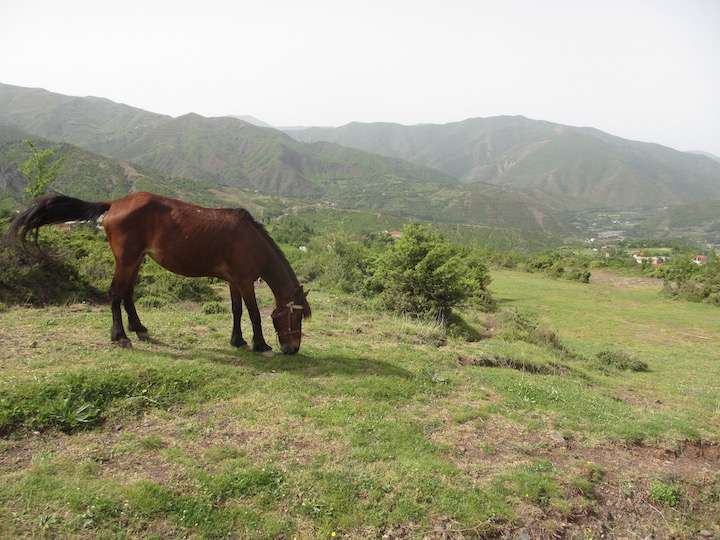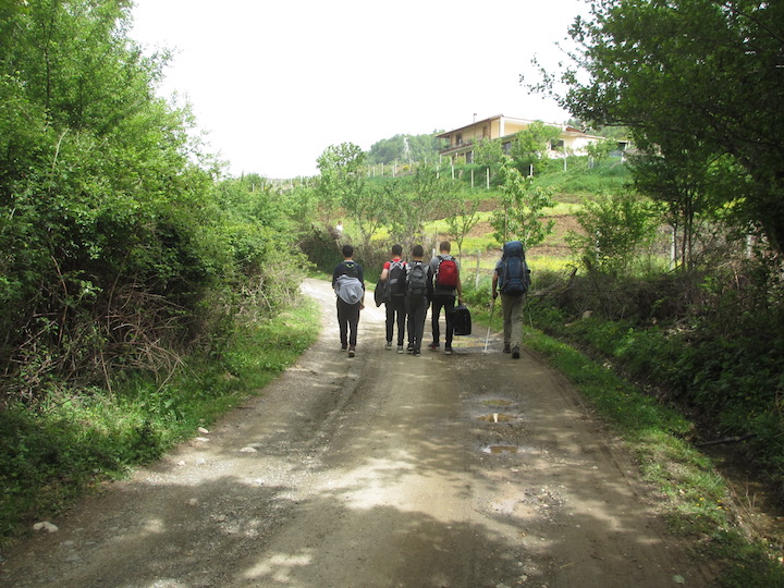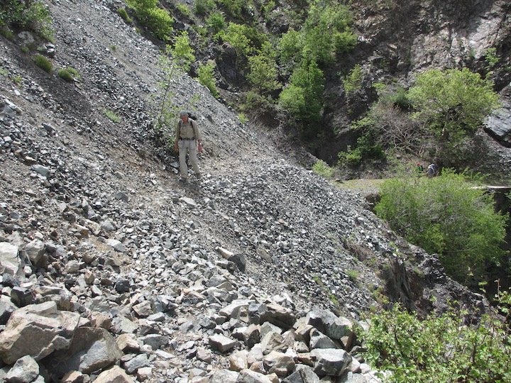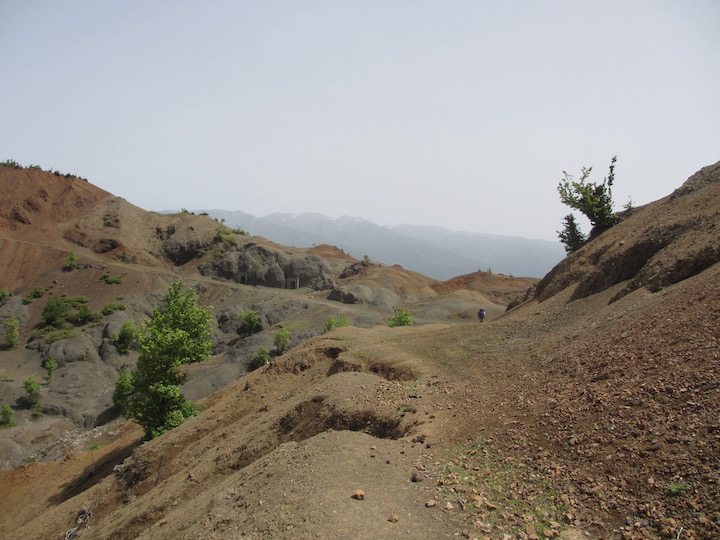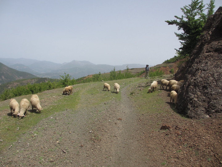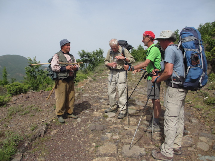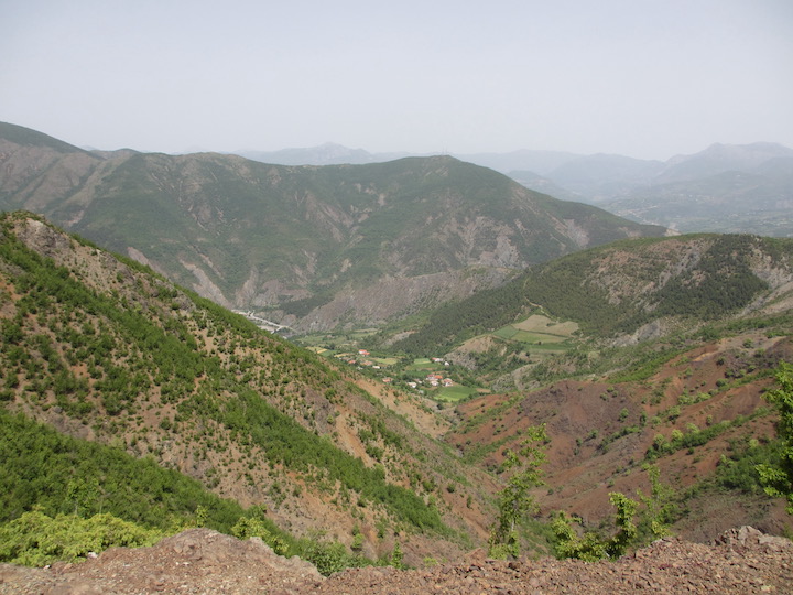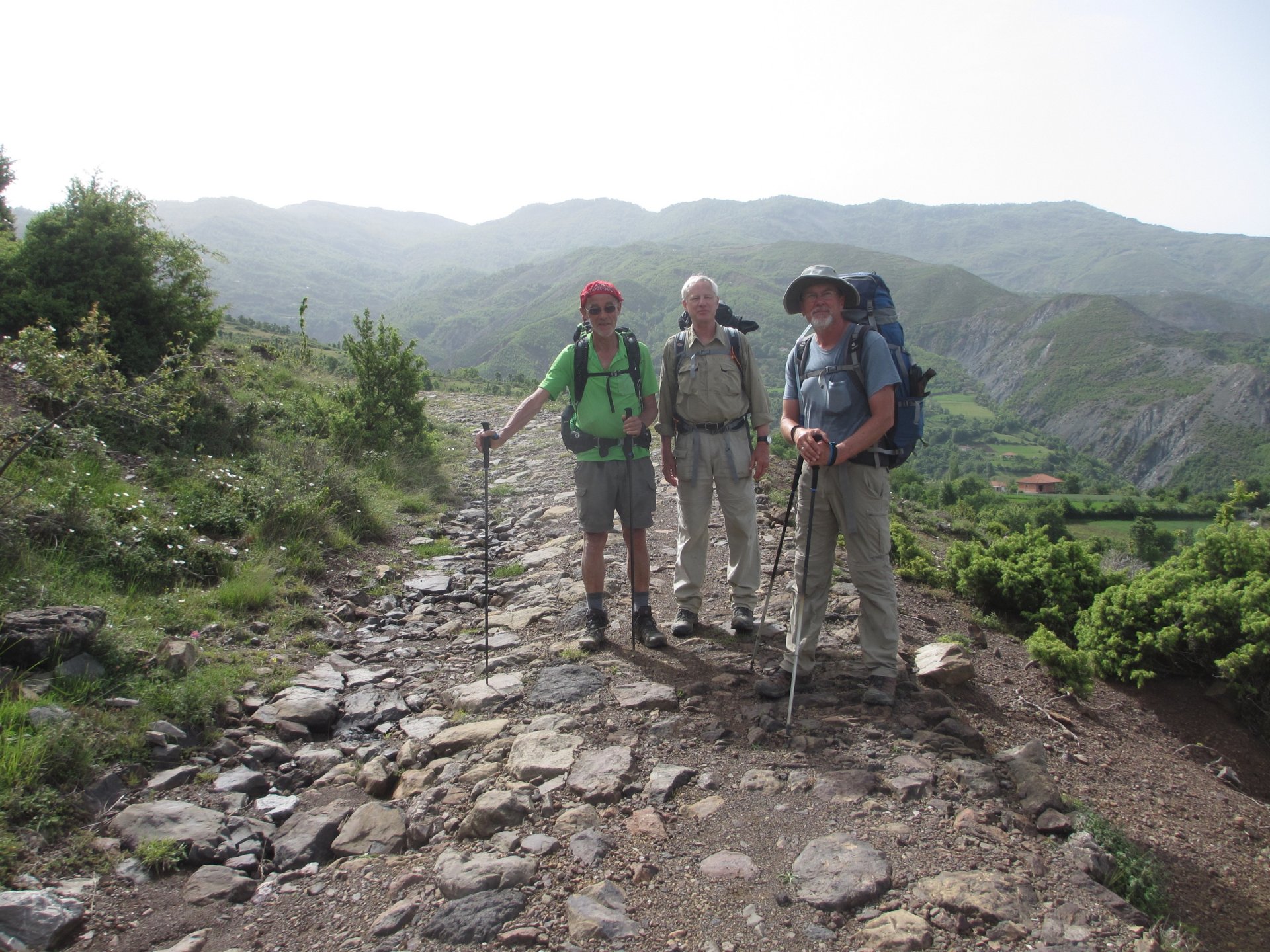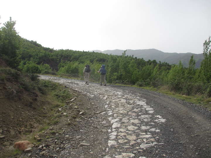 From the Hotel Balkane we walked back up the highway to the bridge. After recrossing the bridge, we walked up the road, and then took the left fork, following the road up the hill. This was an easy climb and a beautiful walk up a high hill. Near the top are some great stretches of well preserved road. As it traverses the hill (is traverses the right word here--check this?), there are several places where the path becomes very narrow (see pictures). Rather than the book's description of 150 meters of "very narrow", its more like several very narrow spots spread out over 400 meters or so. The loose rock is slippery--I wouldn't want to do this section in the rain or mud. We followed the path on, with beautiful views. As the book says, the soil changes to red, then we walked into Upper Babje, where we had coffee and lunch at one of the two coffee shops/bars across from each other. From there we followed the book and the tracks to the short cut path to Dardhe. We found this to be quite workable (a bit steep) and we followed it down the hill into Dardhe where we were welcomed at the bar, and into the school. We slept on the floor of the school over night, and ate at the bar behind the school. The woman at the bar cooked us a feast--several kinds of salad, and chicken with lemons. The school was a great place to stay although the bathroom was very smelly and with eastern style toilets (slits in the floor).