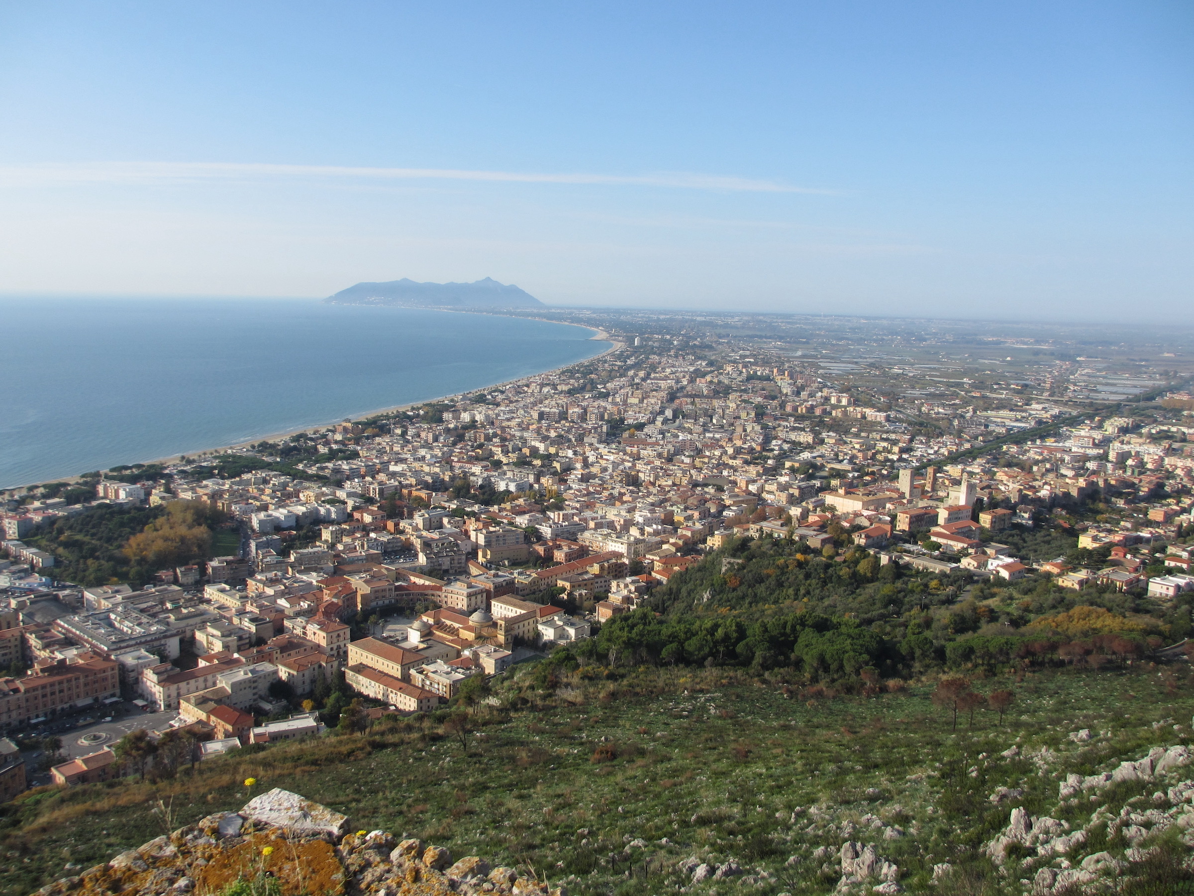 After leaving the sea, the route runs along a hill, a nice path, with continuing great views. Within several kilometers past Terracina, the Lake of Fondi can be seen from the Via Appia, where between it and the mountain (Lautulae Pass) the Romans, in their conquest to the south, were famously defeated by the Samnites in 315 B.C.